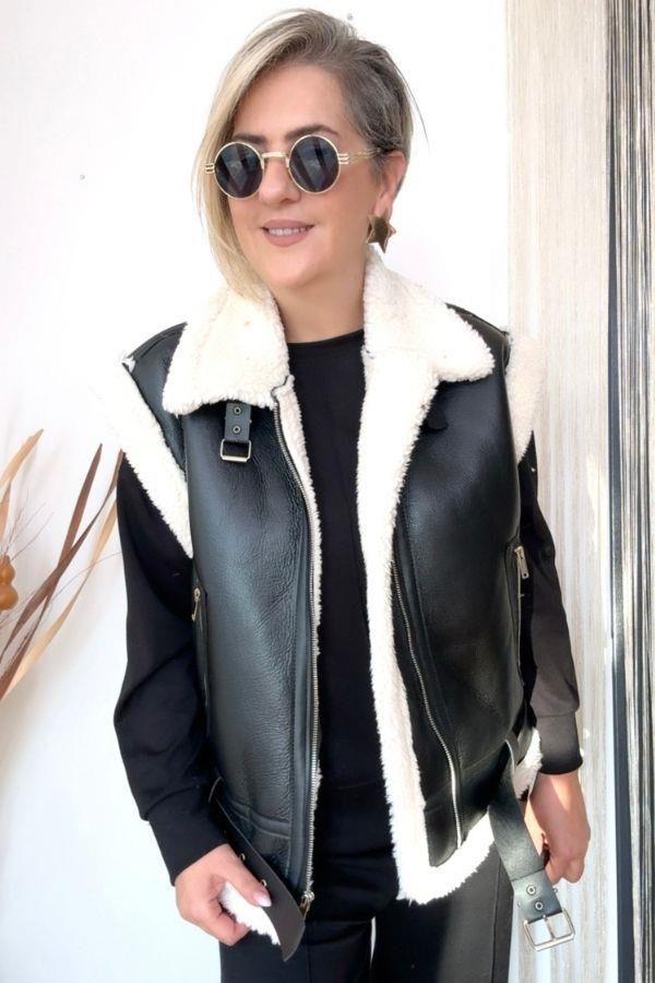 Beyaz Kürk Detaylı Siyah Deri Yelek