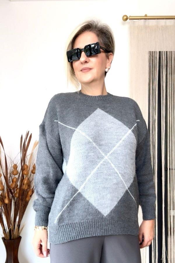 Gri Baklava Desen Modelli Kazak (KZK-1011)