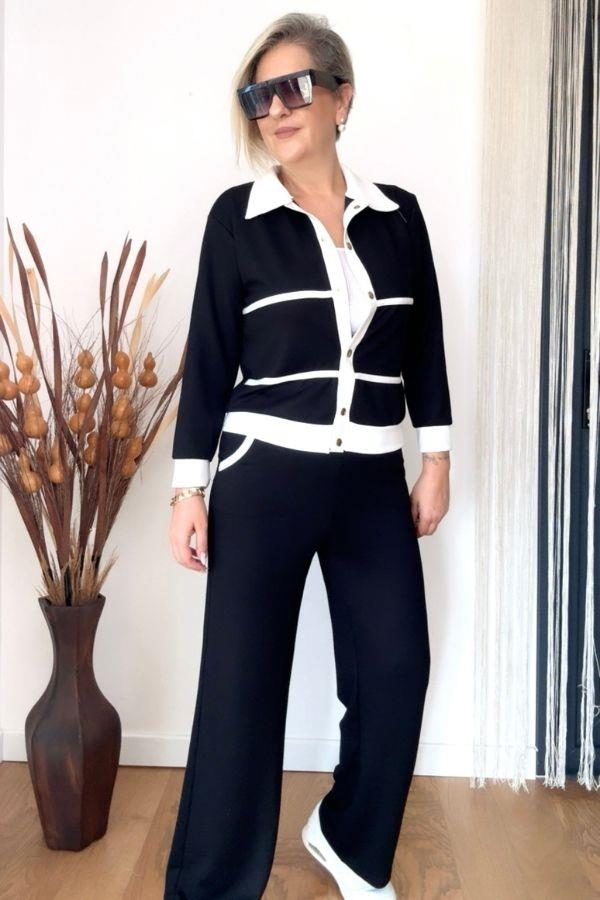 Siyah Beyaz Şeritli Cepli Eşofman Takım